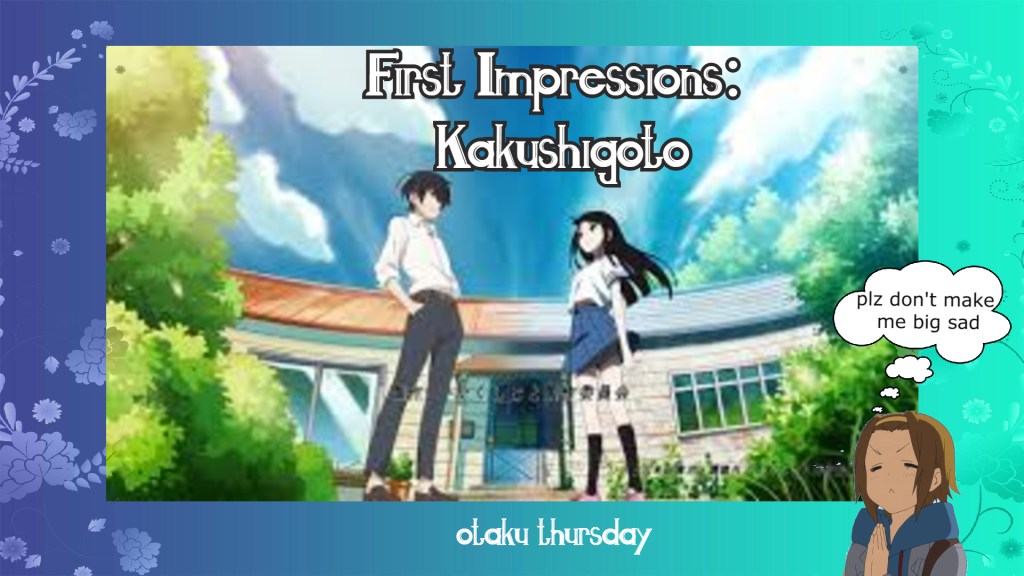 Welcome back to Otaku Thursday! Today I’m here with another First Impressions for this season’s anime…which is slowly receding like a boat in the ocean that had nearly reached shore before being dragged back and sunk into the depths of despair. AKA, a lot of spring anime is getting delayed. Despite that, there are still quite a few good anime currently airing, and one of them that I have been enjoying is Kakushigoto. So let me tell you why.