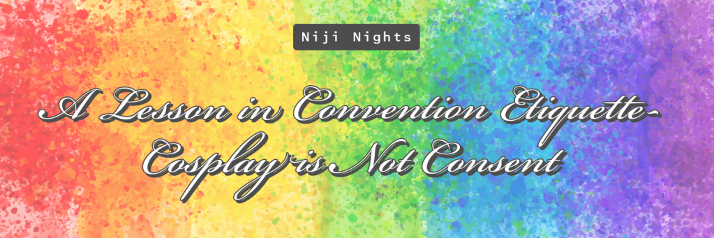 Like the title suggests cosplay is not consent. That means, no matter who is wearing it, it doesn’t mean that the general public or other convention attendees have the permission to act or say things that are disrespectful, degrading, vulgar, because that’s straight up harrasment. If it’s online or in person.