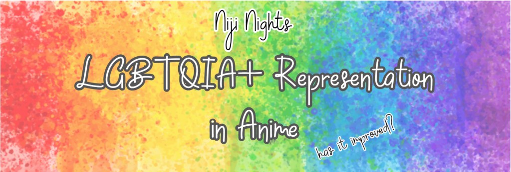 Hello all and welcome back to Niji Nights! Last time I talked specifically about transgender characters in anime in some old school vs. some newer anime. Today, I want to open that door a little wider and just talk about LGBTQIA+ in anime and highlight some good moments for representation in anime over the past few years. Because while our world still has a long way to go, it has made strides, especially in anime, to be more inclusive.