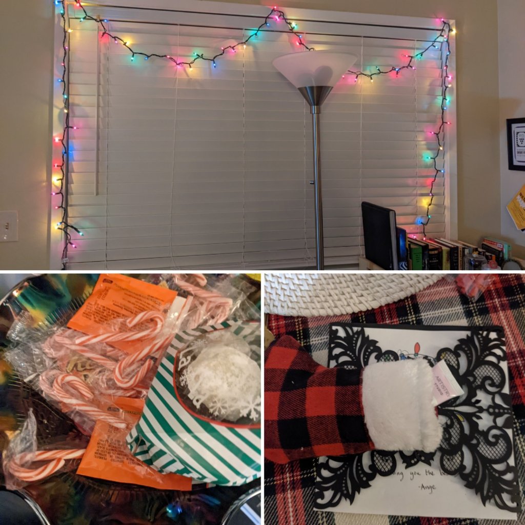 Probably the most fun out of all things. We spruce up the space with pinecones and throw some tinsel, lights, and candy canes everywhere. Weave some keychains on the tree or collectibles with santa hats.