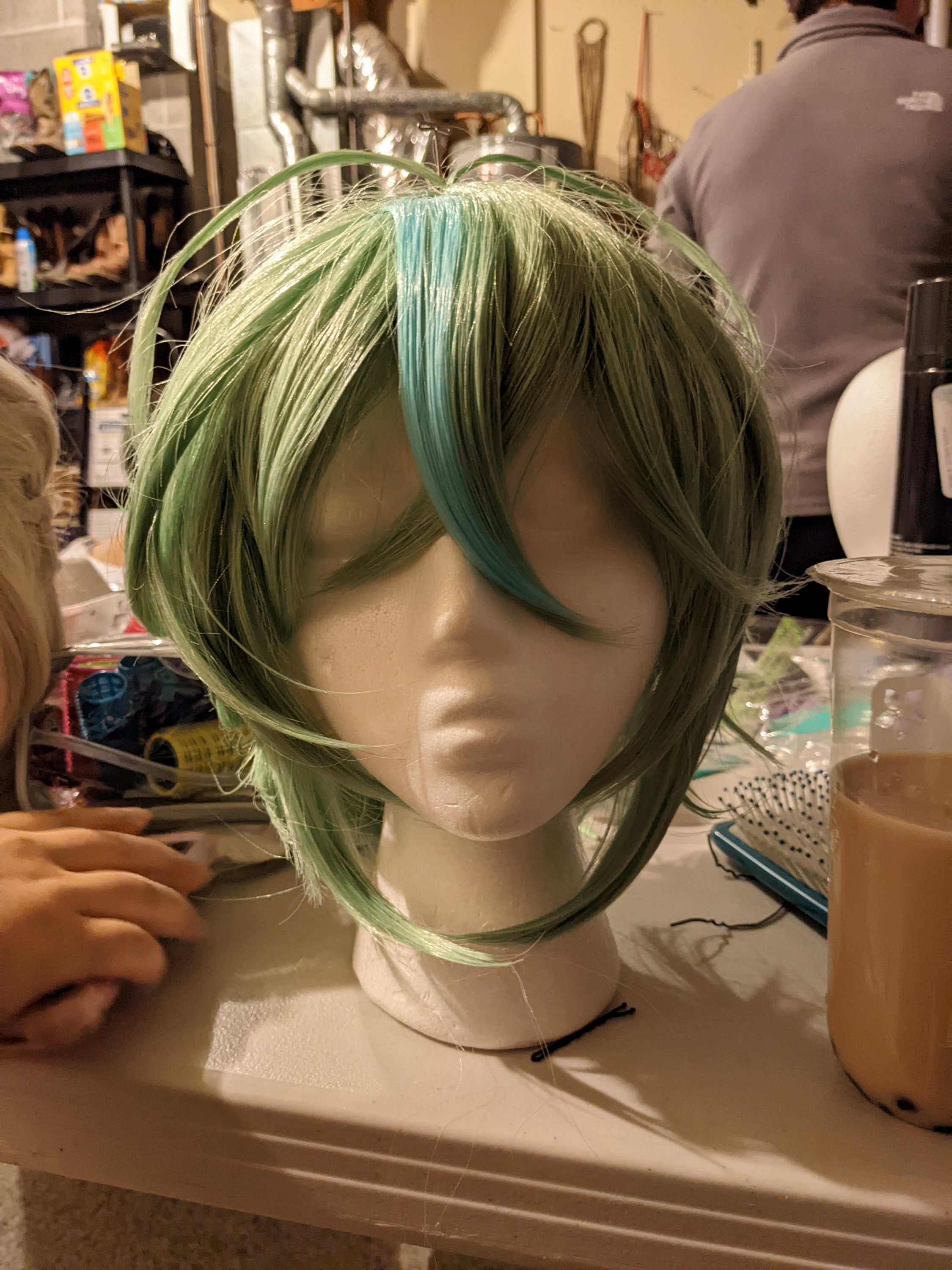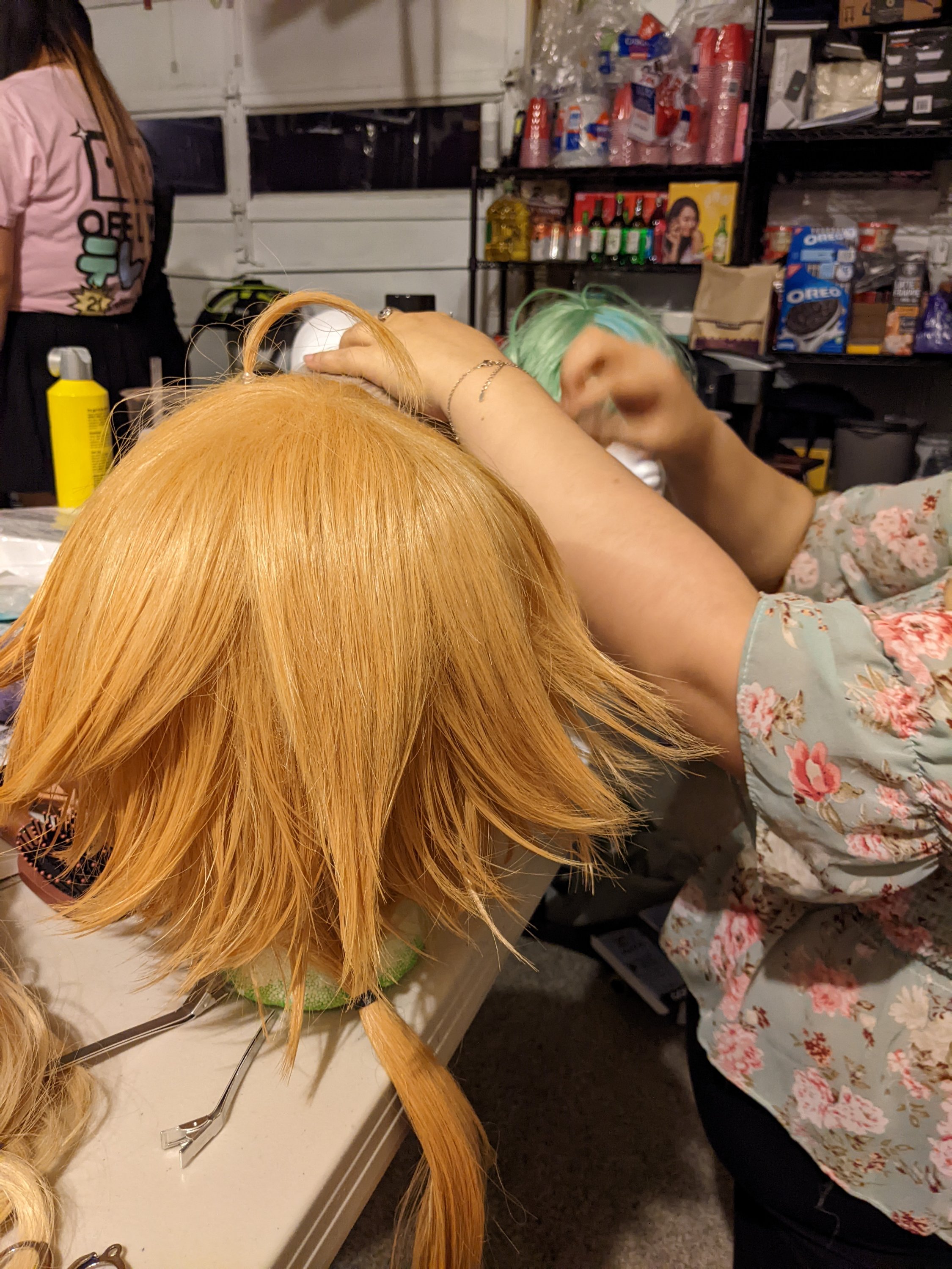 Hey! Recently, Luna and I, Star, were asked to host a wig styling event! It was a quite the feat with 7 wigs for a group cosplay going as characters from Genshin Impact. It was pretty fun actually haha. Being that the group had no experience with styling wigs it was really something wild. As people arrived we sat them in a chair and got to work. Showing them how to properly put on a wig, then cutting the bangs to frame the person’s face to styling it on the wig head. Because of the masssive amount of people, 10 total and a dog, we all gathered in a garage. I’m sure everyone was covered in a thin layer of hairspray by the time we were done and here’s how we did it…