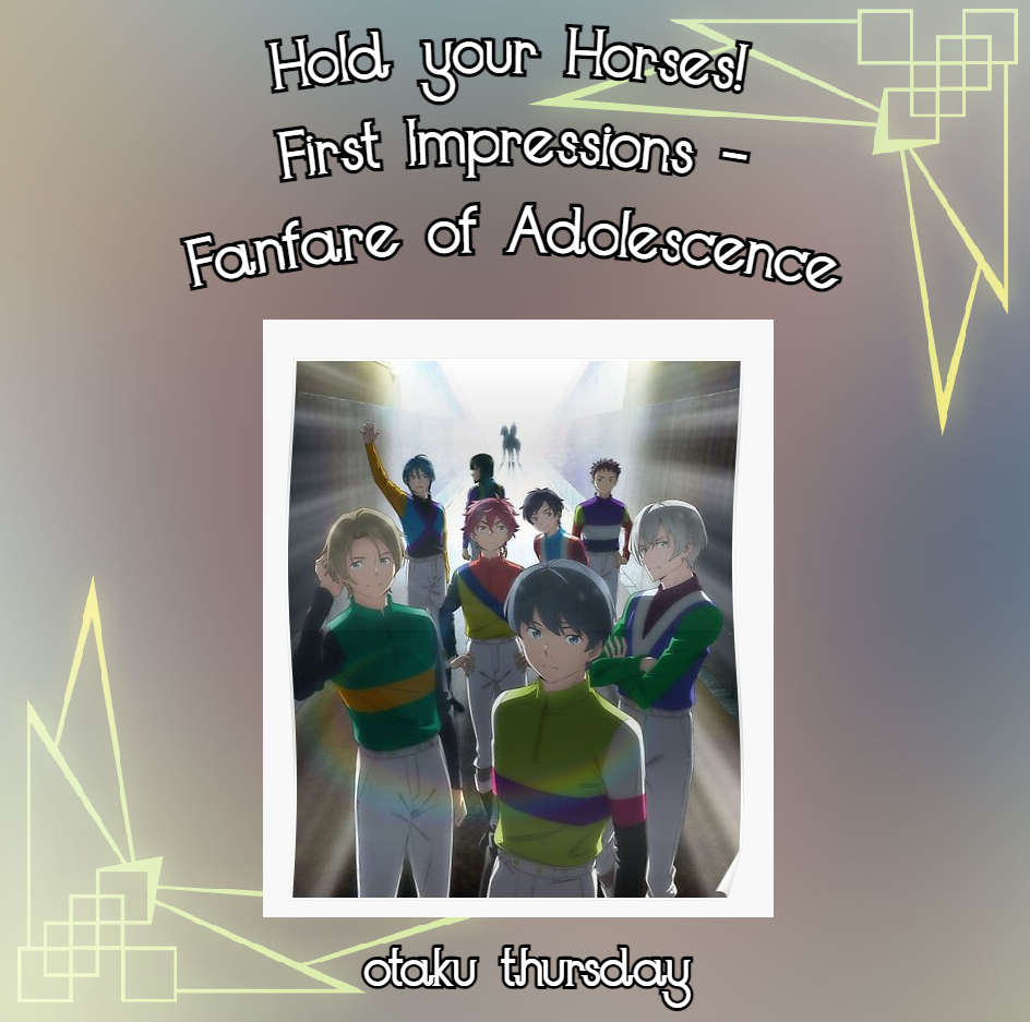 So what is Fanfare of Adolescence and why should you be watching it? Well, it’s a sports anime about horse jockeys and is very drama heavy. Now, let me tell you from the get-go, there is nothing that interests either of us in horse racing normally. But the drama and the tea in this are SO strong. The main character is an ex idol who quits the showman business to become a horse jockey. Due to this, he’s actually really not that good at riding, and he’s being filmed for a documentary about his journey to become a jockey. Already that dynamic within the group is odd–his presence brings so much attention to the jockeys in training and the academy. There are lots of tidbits of the camerawoman interviewing other students. The fact that our MC is an ex-idol isn’t just for fun either. There are already some plotline threads that are coming into play that have to do with the idol industry and just how toxic it can truly be for the idols. To me, that adds some flare to the generic and straightforward sports formula–plus I love me some good idol drama that showcases the difficulties of stars.