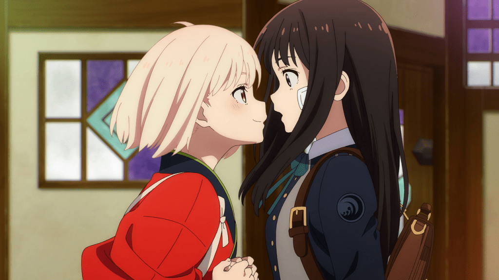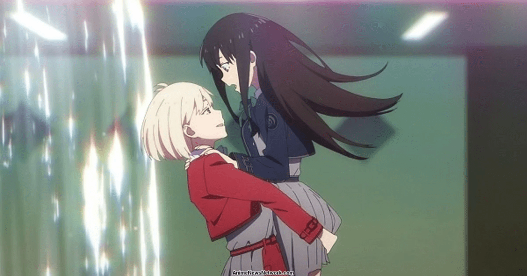 Our red-wearing blonde is quite the eccentric troublemaker named Lycoris who is thrown in as Takina, the black-haired beauty’s field partner. The two of them couldn’t be more opposite. While the girl in red is creative, flirtatious and devious, the girl in blue is serious, naive but incredibly intelligent. The both are top of their class as agents and make an incredibly interesting and dangerous dynamic as they learn more about each other.