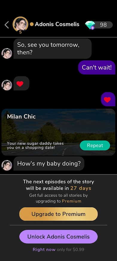 Most of the time the player could survive on 60 gems but as the plot thickens (and I continued playing) 60 gems a date became 100. When it came to dates, there would be more responses and if you couldn’t pay, it would cut the date short. The player would essentially lose out on more interactions with the character. But some choices lead down interesting branches that sometimes made for a more compelling story. But it is mainly in the eyes of the player. But holidays often revealed new characters that spoke to the holiday and perhaps there would be a time when these characters are released for free. But of course gems cost money but if you are patient you can make it pretty far without paying a cent. Watching ads and only playing when you’ve built up gems is the best strategy but if you have an addictive personality you will end up spending the money for SURE.